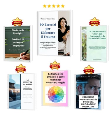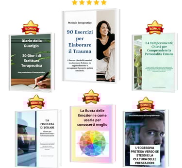 Riceverai il Metodo Terapeutico dei 90 Esercizi per Superare il Trauma, oltre a 5 Bonus Esclusivi che ti accompagneranno in questo processo di trasformazione.